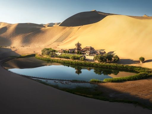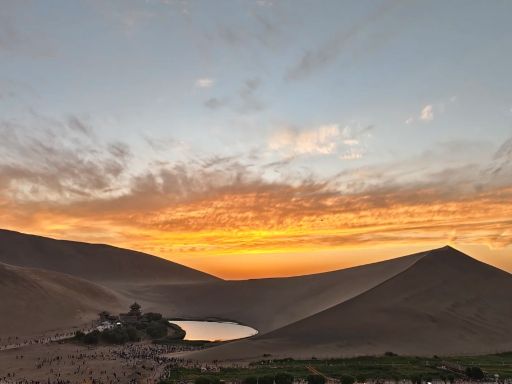 - Mingsha Mountain and Crescent Lake – Also called Echoing Sand Mountain and Crescent Spring, form a famous desert scenic area on the southern edge of Dunhuang, Gansu. Golden sand dunes up to about 1,700 m surround a small crescent‑shaped oasis lake that has existed here since ancient times